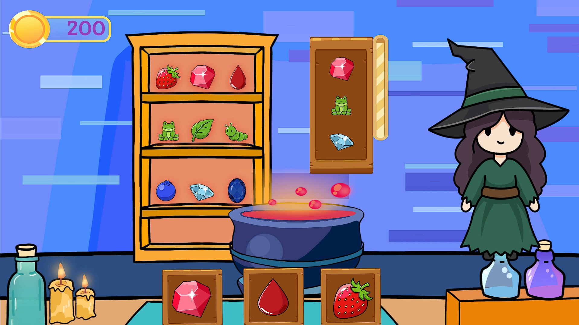 Carefully choose the correct ingredients based on the customer’s recipe. Once you finish mixing the potion, type the magic spell exactly as shown , every word must be perfect, and you have to watch your capitalization! A single typo or missing capital or wrong ingredient will anger the customer and cost you money. But if you brew it right, the customer will be delighted, and you’ll earn gold! Be careful! lose too much money, and you’ll go bankrupt!.